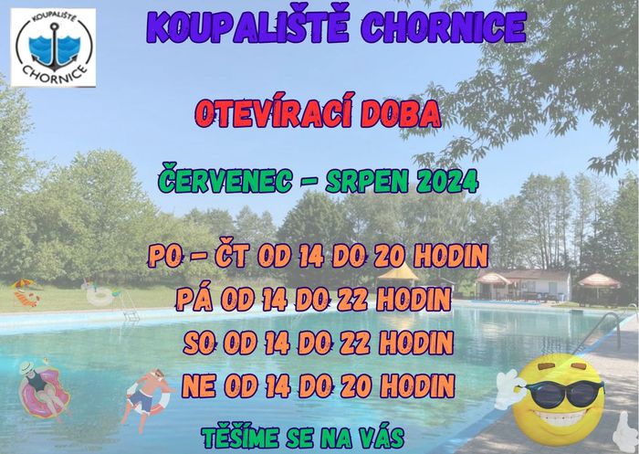 Úvod > Aktuality > Informace > Otevírací doba koupaliště Chornice o prázdninách